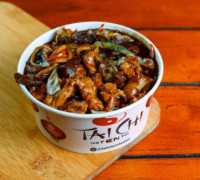 Cubos de frango com legumes ao molho oriental, acompanhado de arroz chop suey, embalagem de 550ml. (Imagem ilustrativa)