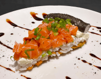 Base crocante de nori empanado em formato de pizza, recheada com arroz de sushi, sabor a sua escolha, cream cheese e cebolinha. (Imagem ilustrativa)
